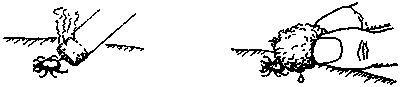 · With tweezers, grasp the tick as close as possible to its mouth - the part sticking into the skin. (Try not to squeeze its swollen belly.) Pull the tick out gently but firmly. Do not touch the removed tick. Burn it.· Or, hold a lit cigarette near it. Or put some alcohol on it.