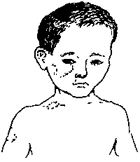 · In small children: a red patch or rash forms on the cheeks or sometimes on the arms and hands. The rash consists of small sores or blisters that ooze or weep (burst and leak fluid).· In older children and grown-ups: eczema is usually drier and is most common behind the knees and on the inside of the elbows.