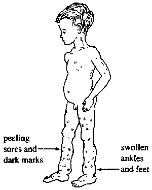 In malnourished children, the skin of the legs (and sometimes arms) may have dark marks, like bruises, or even peeling sores; the ankles and feet may be swollen.