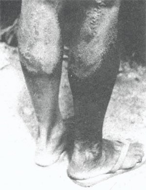 The 'burnt' skin on the legs of this