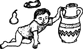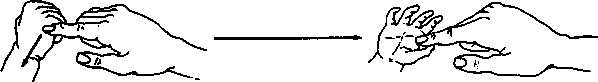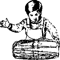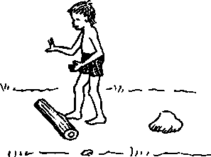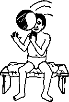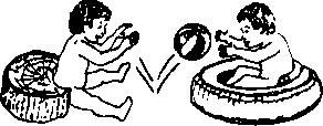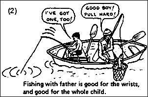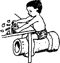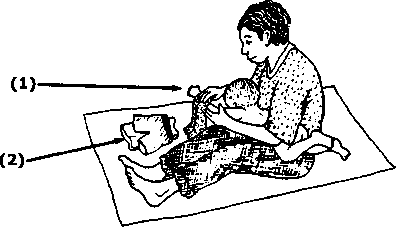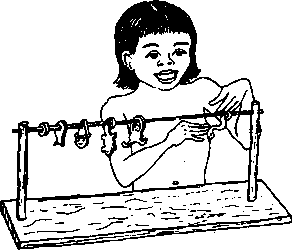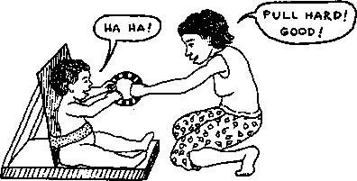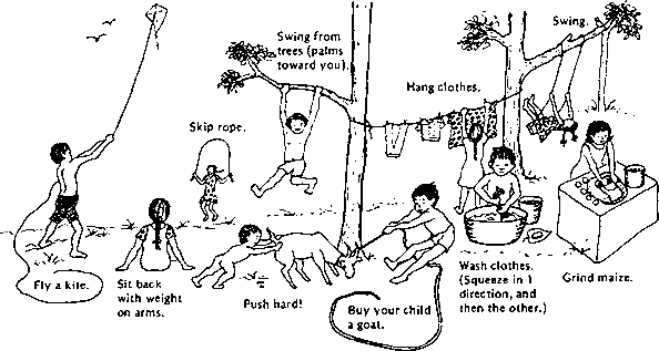 For example, (1) suppose you live in a fishing village, and want to make copies of a drawing showing an aid for strengthening the wrist. Instead of just copying a method like this from a book, (2) you might add a drawing like this one. This will encourage parents to think of ways to do exercises that involve their child in the life and action of their community.