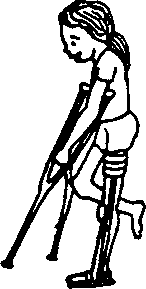SWING TO WALKING Many children who have difficulty taking steps use crutches by pulling or swinging both feet forward to the level of the crutch tips. Then they advance the crutches and pull themselves forward again.