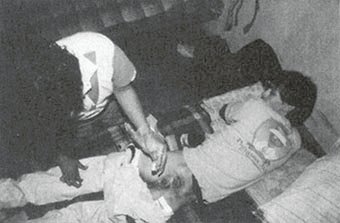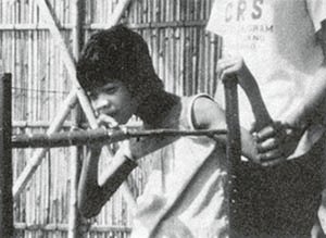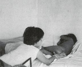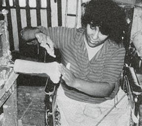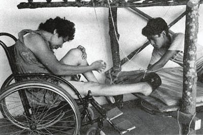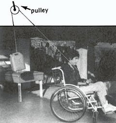 This woman, who has severe spasticity, transfers from wheel-chair to bed using tin cans, ropes, and a wood frame over her bed. (Photo: John Fago, PROJIMO.)