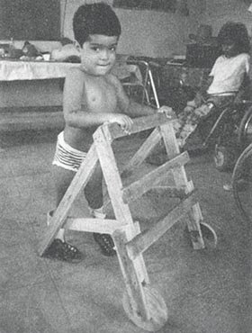 We have seen examples where local carpenters, tinsmiths, leatherworkers or blacksmiths have put together simple crutches, carts, wooden legs and other aids. We know parents who have figured out ways of adapting daily activities so that their children can help do farm work or housework - and at the same time get much of the exercise (therapy) they need.