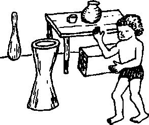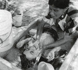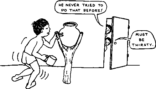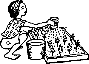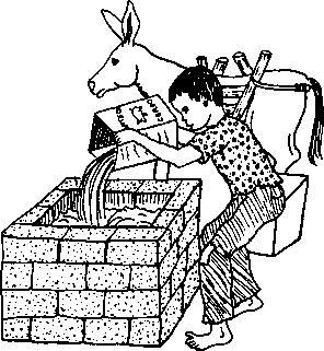As time passed she learned how to carry a bucket of clothes on her head - then a bucket of water. To do this took a lot of practice with balance and control of movement. She just had to keep her legs farther apart to keep her balance. Her mother was almost afraid to let her try carrying the water. But Maricela was stubborn - and she did it! Maricela also discovered that if she floated a gourd dipper (or a big leaf) on top of the water, it helped keep the water from splashing out.