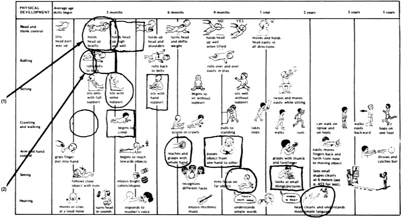 Here is an example. If the child is spastic and beginning to sit, the first 3 activities can help her to improve balance and to develop controlled body movement. So circle these. The next 3 activities will still be too difficult and could increase spasticity. Put an X through these so the family does not do them.