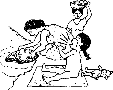 The rock kept her knees apart and the squeezing and banging strengthened her hands and improved her control. But what mattered was getting the clothes clean. It was hard work. But she found it easy - and fun! Coming back from the river, Maricela just had to walk. It was too far to crawl. And besides, she had to help her mother carry back the washed clothes. This was hard, but she tried hard, and could - do it!
