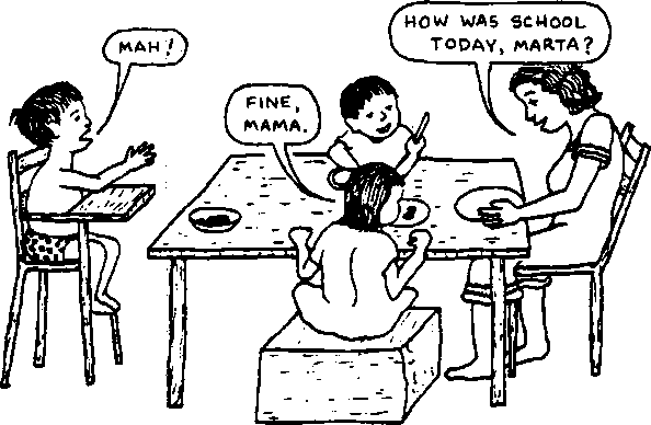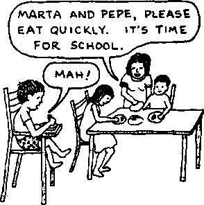 In the cornfield she helped her father and brother clean the weeds out from among the young corn plants. That was good for the young plants - and for her, too! But after several trips to the cornfield on the donkey with her father, Maricela begged him to let her ride alone. He was nervous, but he let her try. She could do it - and what confidence it gave her! Soon Maricela was preparing lunch for her father and brother and taking it to them in the cornfield - all by herself. Now she found she could do many other things she never thought she could. Although she was still awkward, and at times had to look for special ways to do things, she found she could do most anything she wanted or needed to.