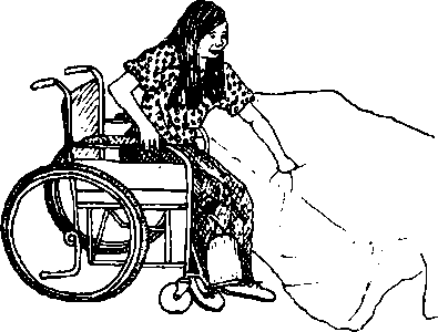 1. Lift feet onto bed and wheel the chair forward against bed. Put on brakes. Then bend forward and lift butt forward on chair. |