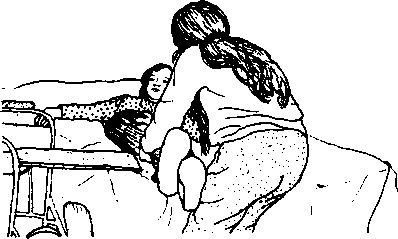 A good way to transfer the child who needs help is like this. Put the childs feet on the floor and lean her forward against your body. Have her hold on as best she can. Lift her like this and swing her onto the bed. |