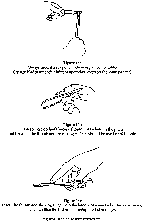 - Suture set (sterilized box of instruments): needle holder, needles, scalpel blade and handle, one or two artery forceps, fine curved scissors with rounded ends, plain scissors for cutting sutures, retractors.