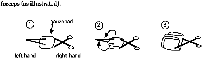 - To make a sterile sponge fold the pads twice using the Kocher and dissection forceps (as illustrated).