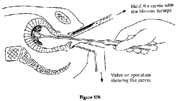 · Introduce a speculum or vagina valve, holding the cervix with certical forceps (Museux forceps).