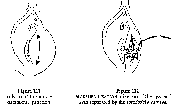 · Marsupialisation of the gland or cyst, that's to say, the walls of the gland is sutured to the skin, to keep it open and to prevent recurrence.