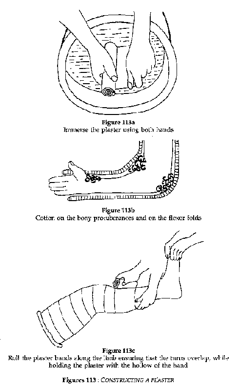 The assistant continues to hold the plaster with the hollow of the hand and never with the fingers. The application must be perfect and must not produce dangerous plaster folds at the flexural creases which can cause severe constriction (just like a tourniquet).