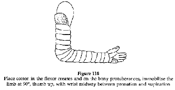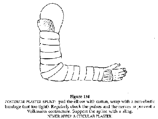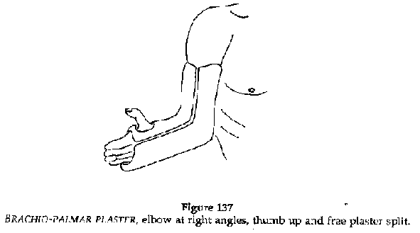 · Immobilisation plaster (Figures 136,137) Elbow at right angles, protected in the flexural fold with cotton, the hand midway between pronation and supination, the plaster covering the brachiopalmar surface as far as the metacarpal joints, leaving the fingers free. IMMEDIATELY SPLIT THE PLASTER. Immobilisation: 3 months for an adult, 45 days for a child.