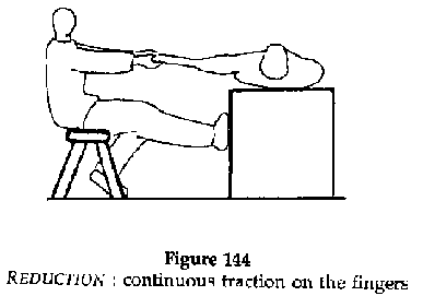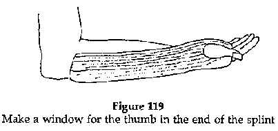 · Immobilisation using a "ball made with plaster of Paris": the operator makes a ball out of plaster and it is held in the palm of the hand. The fractured finger is strapped to the ball with an adhesive tape. In cases of a fracture of a metacarpal, the ball is first fixed to an anterior forearm splint which is held in position with a bandage leaving the fingers free.