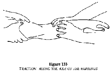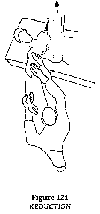 · Reduction: under general anesthetic (ketamine IM: 5 mg/kg) The patient lying on a table, counter-extension applied by an assistant holding a folded drape in the axilla, across the thorax and pulling towards the other shoulder. The operator places his stockinged foot in the axilla of the patient without pressing on the vascular/nerve bundle, and abducts the arm. A movement is felt as the humeral head re-enters the glenoid cavity.