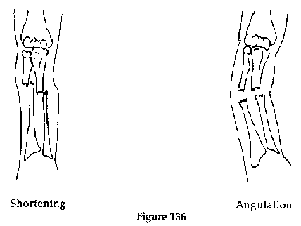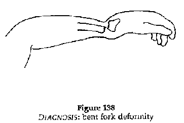 Pain, reduced movement of the wrist. Characteristic "bent fork" deformity of the wrist (Figure 138).