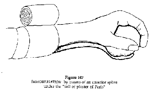 It is sometimes difficult but necessary to have an X-ray. If this is not possible (no evacuation possibilities, no hospital) and in doubtful cases, it is better to immobilise the fracture in a posterior plaster rather than in a full circular plaster. For example, in children when a forearm fracture is suspected, for which only an X-ray will confirm the diagnosis, a splint maintained with a bandage will produce good results, and with no risk.