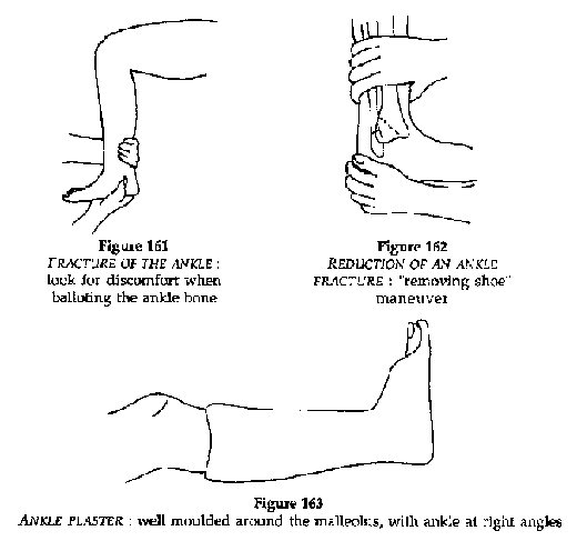 · Reduction under general anesthesia (ketamine IM 5 mg/kg) with the "removing shoe" maneuver: a hand on the leg, the other supporting the heel and reduce the fracture with the same movement as removing a shoe (Figures 161, 162).