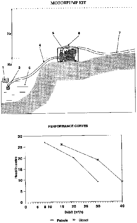 Total pumping head (suction + delivery): 28 m. Fuel capacity:2.5 l giving 3 hours running.The motorpump is mounted on a frame and weighs 28 kg. The 4-stroke engine is fitted with a low-oil security system.