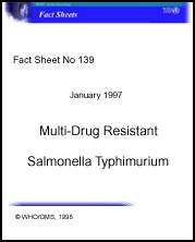 England and Wales: The disease reporting system in England and Wales has revealed a ten-fold increase in the number of human cases of multi-drug resistant Salmonella typhimurium DT 104 in the six year period 1990-1996 going from 300 to 3500 cases per year. This specific strain is second only to Salmonella enteriditis as the most common salmonella in humans in England and Wales in 1995 and more than 55% of cases of Salmonella typhimurium in humans were caused by the muilti-drug resistant DT 104. It has worked out stable resistance to some of the most common antibiotics: ampicillin, chloramphenicol, streptomycin, sulfonamides, and tetracycline. Since 1994, an increasing number of isolates with additional resistance to trimethoprim and a few with additional resistance to ciprofloxacin have been reported. Infection with multi-drug resistant Salmonella typhimurium DT 104 has been associated with hospitalization rates which are twice that of other zoonotic food-borne salmonella infections and with ten times higher case-fatality rates.