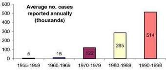 Forty percent of the worlds population is now at risk from dengue but only a small proportion of cases are officially reported to WHO. Nevertheless, 1998 witnessed unprecedented levels of reporting, with approximately 1.2 million cases from 56 countries. However, an estimated 50 million infections occur annually, including 500,000 cases of DHF and dengue shock syndrome, with 24,000 deaths, mostly in children.