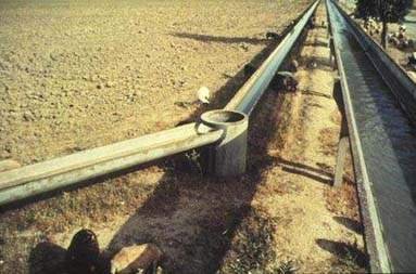 Water contact is inevitable when farmers install their siphons for furrow irrigation, but flow rates are usually high and hence schistosomiasis risks low. Furrow irrigation can give rise to unequal water distribution in the fields, with pool formation in some parts. An improved version, called surge irrigation, applies water intermittently, to allow from a gradual adaptation of soil permeability.