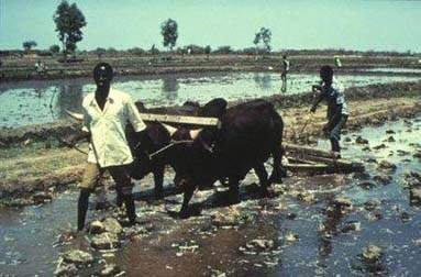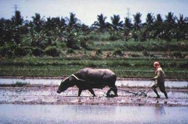 Traditional methods of land preparation for irrigated lowland rice still employ animal power, such as the oxen in the African example (G.1) and the carabao - water buffalo - in the Philippines (G.2). Vector-borne disease issues include water bodies used by cattle, human-livestock-vector contact patterns, livestock in the domestic environment and the potential for zooprophylaxis (all covered in section H).