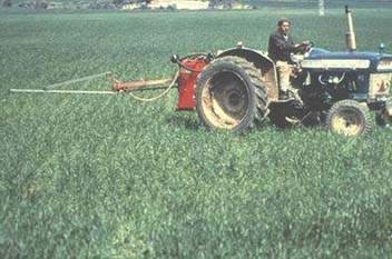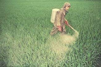 An essential operation in farming is the control of crop pests, whether weeds, fungi or insects. The first two slides show a common form of control using a liquid pesticide in manually operated knapsack sprayers on rice seedlings. The third slide shows the individual application of powdered pesticide on rice, and the fourth one a primitive application method unlikely to achieve the necessary regularity of distribution.