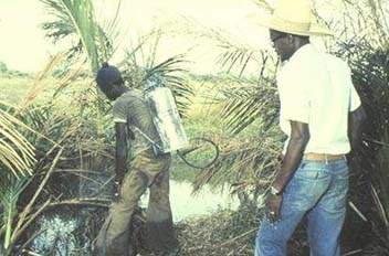 In this particular slide (J.6), the fertilizer that is being applied had been mixed with neem cake prior to the broadcasting. Neem is a botanical product with insecticidal properties. The seeds of the neem tree are pressed to obtain the oil, and the left-over pulp (neem cake) has been tested in a number of field trials for their possible effect on the populations of Culex tritaeniorhynchus. Product standardization remains a problem without purification and characterization of the active ingredient Joint studies by the Centre for Research in Medical Entomology and the Tamil Nadu Agricultural University, both in Madurai, India, nevertheless demonstrated its effectiveness in irrigated rice fields in reducing vector populations at the very start of the irrigation cycle, but the vector density peak was only delayed and not eliminated, as the neem was broken down more rapidly than expected. As a beneficial side effect, there was a notable reduction of damage to the crop by the rice brown planthopper; on the negative side, there have been reports that neem has a detrimental impact on non-target organisms, including fish.