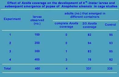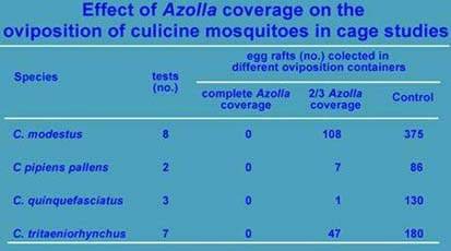 Laboratory studies in China on the effect of Azolla coverage on mosquito oviposition and emergence showed that culicine mosquitoes can not lay there eggs at all in water that is completely covered with the fern. Under the same conditions, anophelines are not hampered in their oviposition, but larval development is retarded and successful emergence of the adult mosquito from the pupa is blocked.