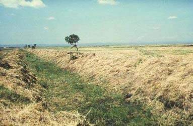 Concrete lining of canals (slide J.21, Hippo Valley Estate, a sugar estate in southern Zimbabwe) contributes to controlling snail populations, because higher flow speeds can be maintained and weed growth is minimized. Concrete lining also reduces seepage and the creation of pools where mosquitoes can breed. Observations have been made in studies in Pakistan that with time seepage re-occurs as cracks form in the lining; pools are, however, fewer in number and more clustered.