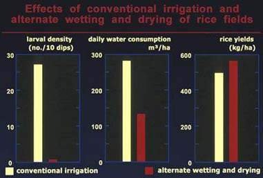 Studies in China by Lu Bao Lin have demonstrated the effectiveness, under local conditions, of alternate wetting and drying of rice fields as opposed to permanently flooded fields, in controlling populations of Anopheles sinensis. Agronomic studies, run in parallel, showed a greater yield in the fields subject to the wetting and drying regime.