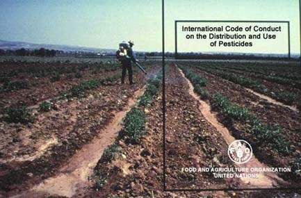 The International Code of Conduct on the Distribution and Use of Pesticides was developed by FAO in consultation with appropriate UN agencies and other organizations. The objectives of the code are to set forth responsibilities and establish voluntary standards of conduct for all public and private entities engaged in or affecting the distribution and use of pesticides, particularly where there is no or an inadequate national legislation to regulate pesticides. It focuses on the management, testing, regulation, distribution, trade, labeling, packaging, storage and disposal of pesticides. The Code of Conduct can be obtained from FAO, Via delle Terme di Caracalla, 00100 Rome, Italy.