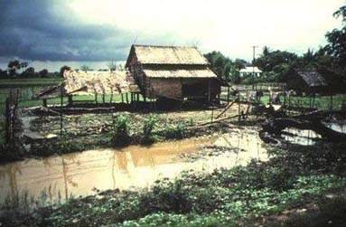 This settlement in a rice producing area in Myanmar appears to have all the features of a place where vector-borne disease problems are not a mere hazard, but a real risk. Myanmar is one of the countries where rodent-borne diseases are a serious public health problem. Clearly, agricultural areas with storage of grains and other produce, have large rodent populations. Depending on the region, leptospirosis, plague or scrub typhus may be important public health problems.