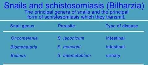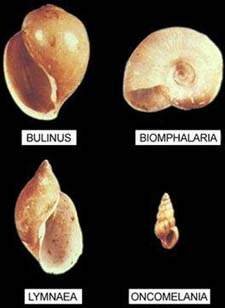 The three snail genera, Biomphalaria, Bulinus and Oncomelania each transmit a different species of Schistosoma. Apparently, within this system there is also a great deal of parasite strain specificity for snail species. Oncomelania snails are amphibious, and therefore environmental risk factors for japonicum schistosomiasis differ markedly from those of the other parasite species, whose intermediate hosts are strictly aquatic, even though they survive periods of drought for periods up to twelve months, a phenomenon known as aestivation.