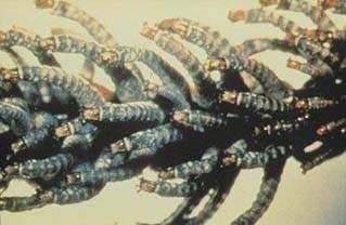 The larvae of the blackfly (Simulium damnosum spp.) live attached to a substrate in the fast flowing parts of rivers, where they filter out particles for their nutrition.