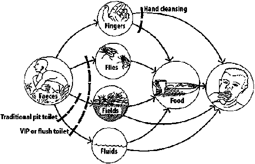 The aim of any community programme to prevent diarrhoeal diseases is to block the transmission routes of germs. The F-diagram stresses that good sanitation is a combination of facilities and behaviours. The following three key hygiene behaviours lead to the greatest reduction in diarrhoeal disease: