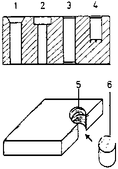 1 bore for flat head screws, 2 bore for cylinder head screws, 3 through hole, 4 bottom bore for dowels, 5 drilled out defect, 6 wood disk to be inserted