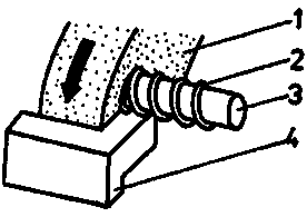 close-setting of dead coils 1 grinding wheel, 2 spring, 3 mandrel, 4 grinding