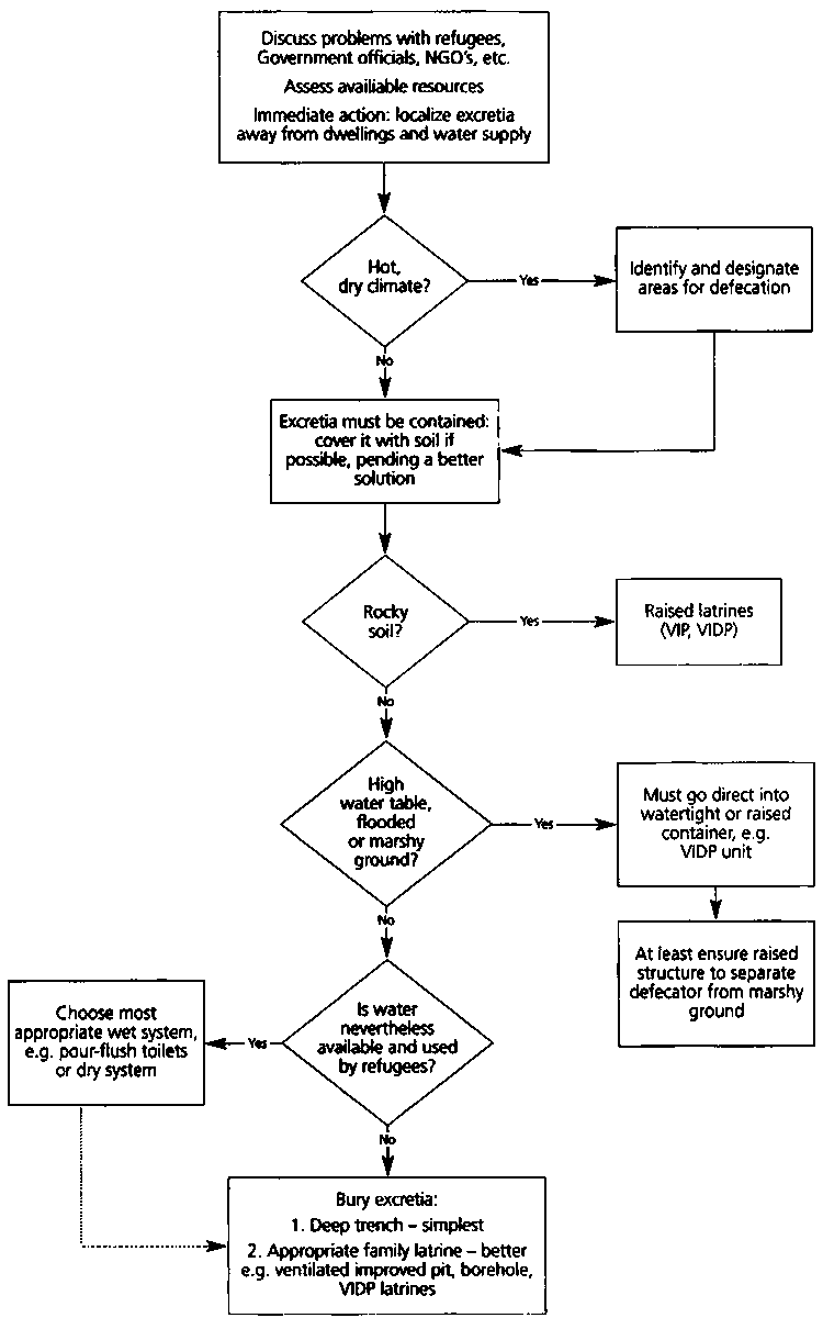 25. Two main factors will affect the choice of an excretia disposal system: the traditional sanitation practices of the refugees and the physical characteristics of the area, including the geology, the availability of water, rainfall and drainage. Failure to take proper account of these can easily result in the system itself rapidly becoming a health hazard.