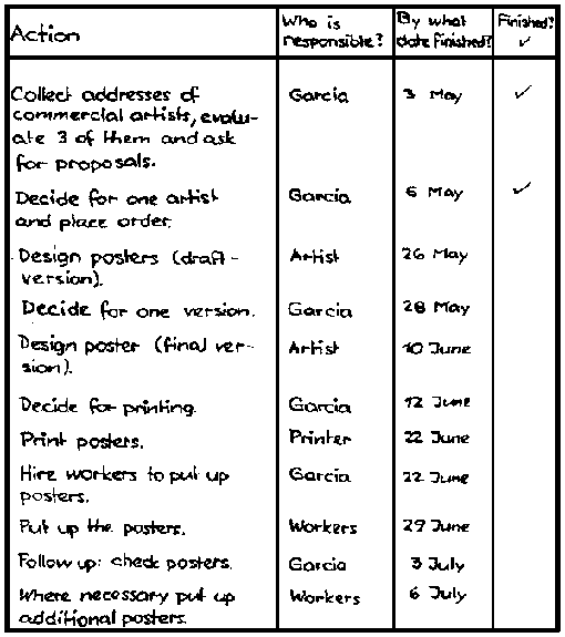 Mr. Garcia decided to put up posters in town. Now, he thinks about the implementation of this decision: First he needs attractive posters to put up. However, he is not an artist Thus, he needs an artist, who could create posters. He knows a few artists. But, who is the best? He has to evaluate one artist. When the artist comes along with his ideas, he has to decide for one idea. Then the artist needs some time to create the poster. NOW the poster has to be printed. When the posters are ready, there are workers needed to fasten them all around the city. He has not enough workers to do so, he needs to hire additional workers. Then, he has to instruct his workers. When the workers have done their work, he has to check it and, if necessary, fasten some additional posters. He writes all these actions down, step by step. Then he thinks about the dates and the responsibilities. |