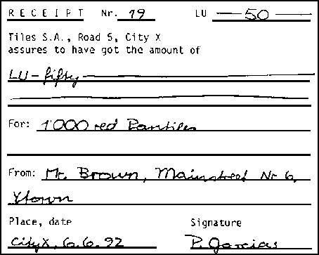 If your supplier of raw materials comes along with an invoice, you do not need to write a receipt. In this case, the invoice can also be used as a receipt. It is sufficient, when your supplier writes on the invoice that he has received the money and signes this statement (town, date and signature) as it is shown below.