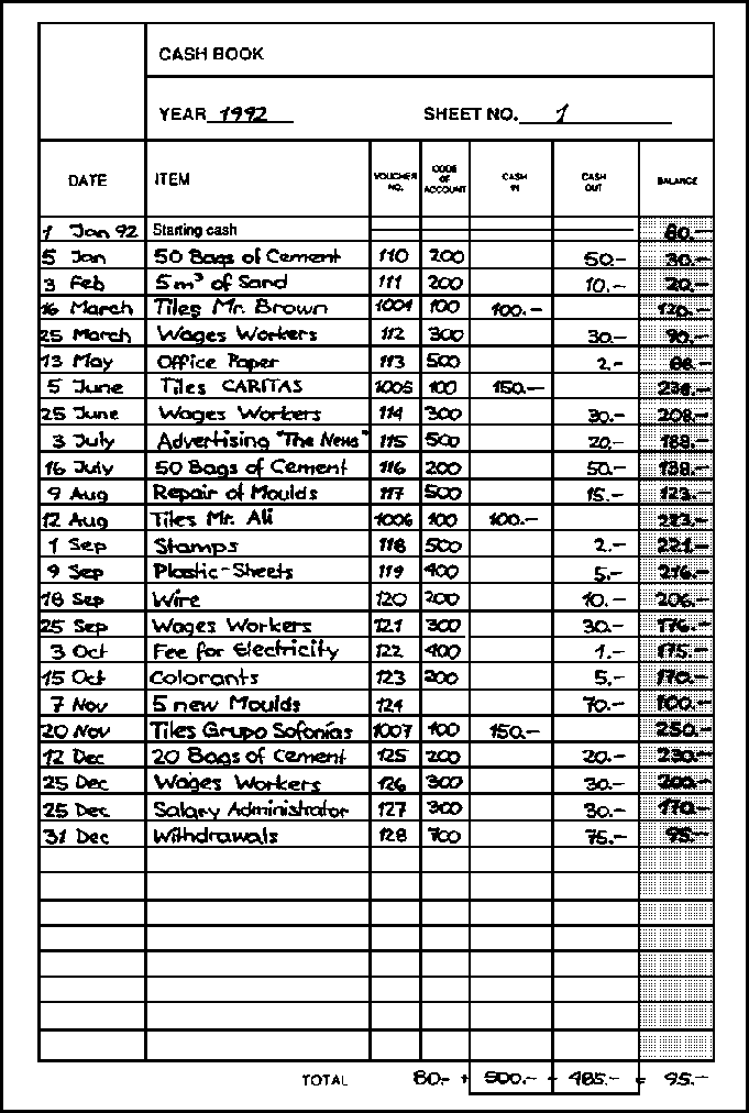 · Code of account. One purpose of the cash book is to keep control over the cash situation. Another purpose is to prepare the data for the profit and loss statement (see module 5), which allows you to analyse the financial situation of your workshop. In order to relate the cash transactions to the positions of the profit and loss statement, every position of the profit and loss statement is identified with a code and all cash transactions which correspond to that position receive the same code.The coding system used in the profit and loss statement of module 5 looks as follows: