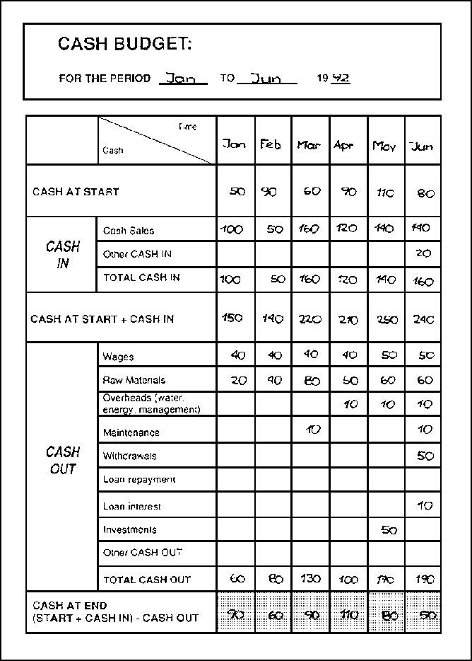The cash budget is a plan which shows the future movements of cash - the cash flow - in and out of the business. A cash budget is a projection - a look into the future. Some amounts will be known, but others will have to be estimated. The following is an example of a simple cash budget: