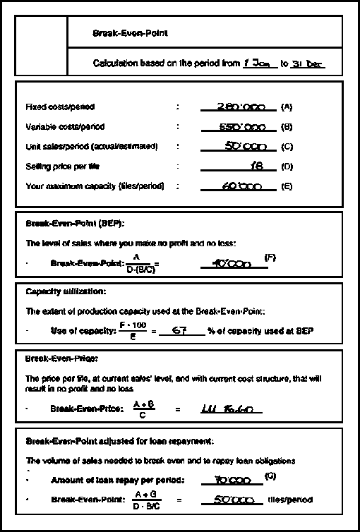 On the following page, you see an example how the calculation of break-even-point, capacity utilization, break-even-price and breakeven-point with loan repayment could look like. The figures needed for the calculations are taken from a profit and loss statement, the manufacturers equipment specifications, or are estimated based on actual experiences.