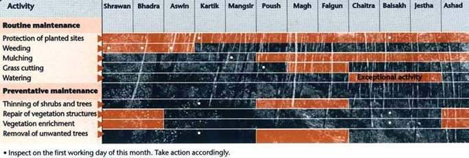 Civil engineering works must be completed before the start of the rainy season. This usually disrupts work seriously from Jestha (May-June) onwards. Hence the calendar in Figure 1.4 (step 15) suggests carrying out site preparation works in Magh (January-February), and implementing the civil engineering works between Falgun and Baisakh (mid February to mid May).