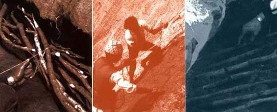 4 Split the grass plants out to give the maximum planting material. Trim off long roots and cut the shoots off at about 100 mm above ground level. Wrap the plants in damp hessian to keep them moist until they are planted. Remember that you will need two slip cuttings per drill (planting hole) if the grass is a fibrous rooting type (e.g. babiyo, kans, khar, phurke, etc.) but only one if it is rhizomatous (e.g. amliso, padang bans, etc.), and only one rooted stem cutting or seedling.